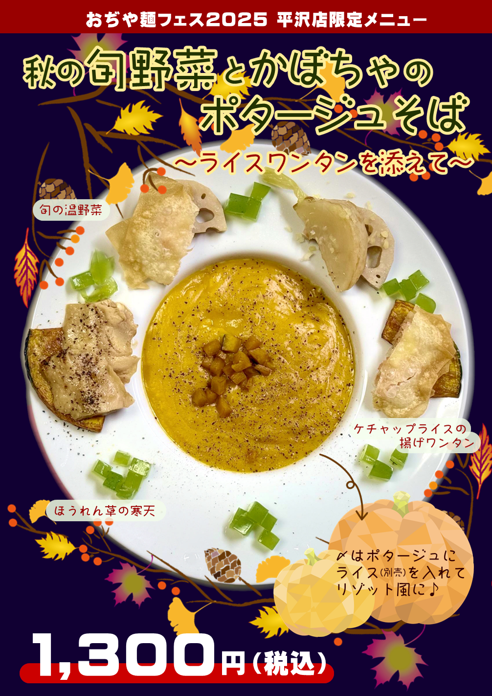 なめらかなかぼちゃのポタージュにへぎそばを絡ませてお召し上がりください。